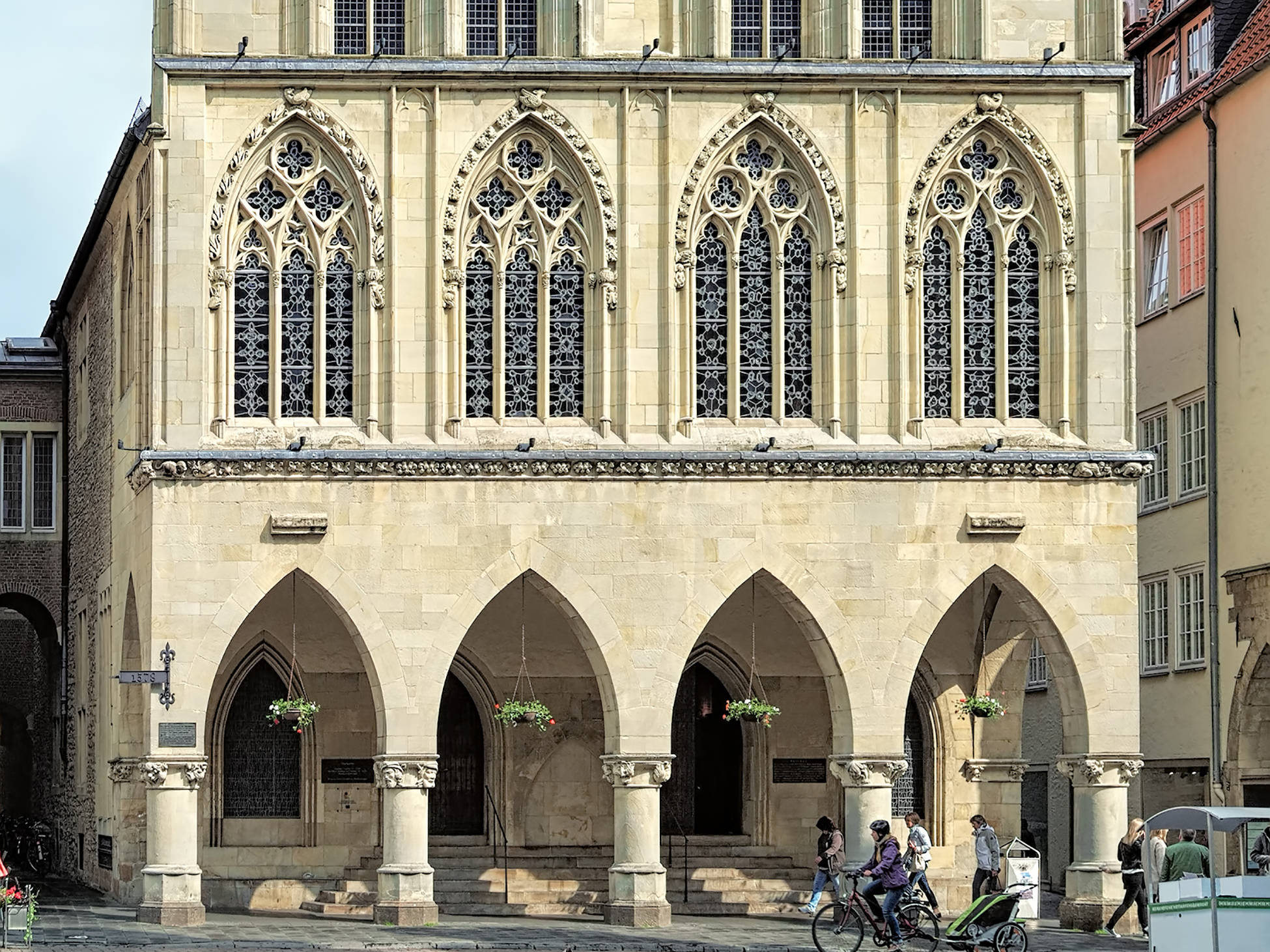 Den Mittelpunkt der Altstadt bilden der mächtige St.-Paulus-Dom und der Domplatz. Wenn Sie genau hinsehen, können Sie auf dem Platz noch die Umrisse der ehemaligen Domburg aus dem 14. Jahrhundert erkennen. Hier waren die Kurien der Domherren und die Pfarrkirche St. Jacobi für Diener und Gesinde untergebracht. Auch heute befindet sich direkt neben dem Dom das Bischöfliche Palais des Bistums Münster. In der Sichtachse genau gegenüber errichteten die wohlhabenden Bürger von Münster vor dem Michaelistor das Historische Rathaus – im 14. Jahrhundert war das eine gewollte Machtdemonstration und Provokation gegenüber dem Bischof.