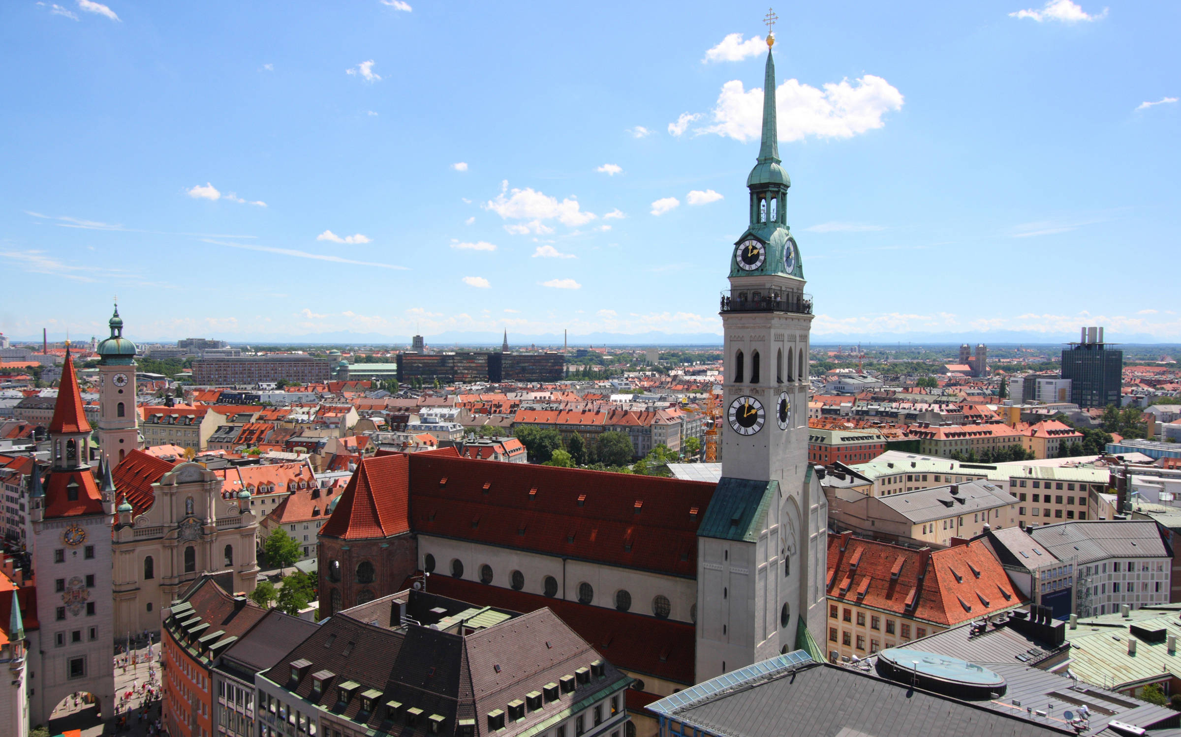 Um auf die Aussichtsplattform im Kirchturm des Alten Peters zu gelangen, müssen Sie zunächst 300 Stufen bewältigen. Der Aufstieg lohnt sich aber. Sie haben von oben eine wunderbare Aussicht auf den berühmten Viktualienmarkt und bei gutem Wetter bis zu den Alpen. Darüber hinaus kommen Sie im Turm selbst an der Glockenstube vorbei.